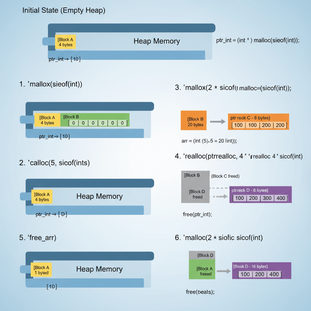 Step-by-step malloc, calloc, realloc functions illustration